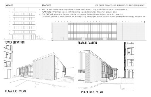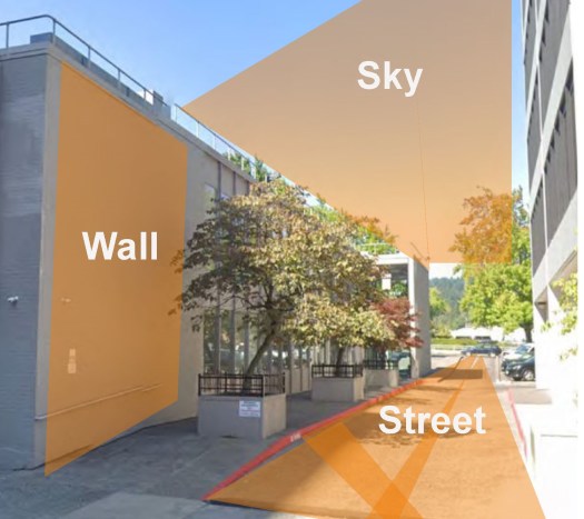 Design opportunities include the walls, ground, sidewalks, and in the air between the buildings.